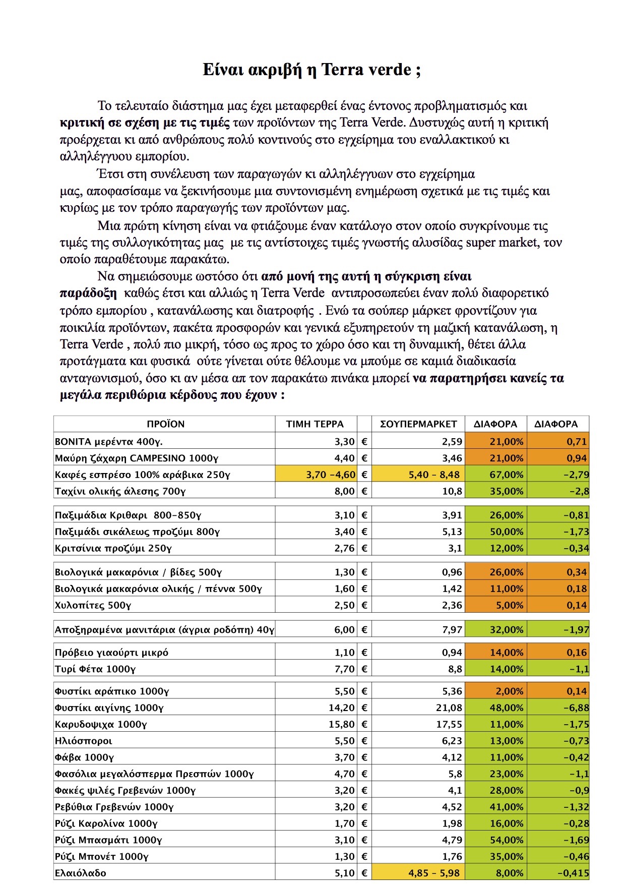 Σας επισυνάπτουμε εγχειρίδιο με συγκριτικό πινάκα τιμών προϊόντων της terra verde και αλυσίδας super market